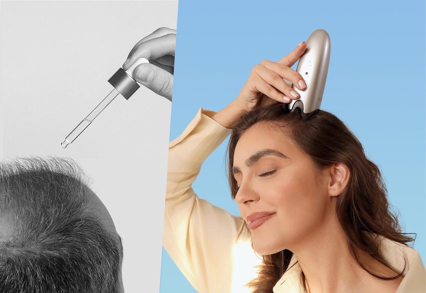 Our world-first one-handed hair loss treatment device utilizes our unique IntelliMist technology, delicately delivering hair tonic straight to where it's needed most, efficiently and effectively within just 15 seconds.